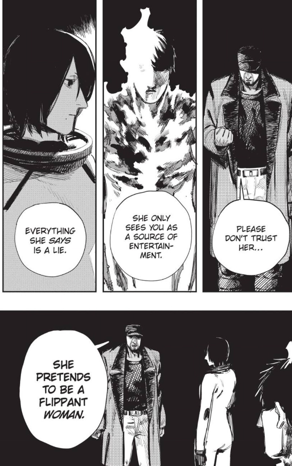One can’t help but think, even if Togata can’t get surgery, surely there’s some other way for him to live as a man. Hormones might not be available in the post-apocalypse, but binders aren’t hard to make. 300 years is a lot of time to practice carrying oneself like a man. Togata just…doesn’t see it as an option. “The male Togata wouldn’t have survived in this world,” he tells Agni. The world of Fire Punch might be deeply misogynistic, but in light of that, it’s still better to be seen as a woman — a terrifying, immortal woman — from the jump than to have that revealed later. He can’t afford to show weakness; he can’t afford to have cracks. So he lies to himself. And it doesn’t work.